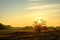 Een boom met een ondergaande zon in natuurreservaat De Teut in Zonhoven, België.