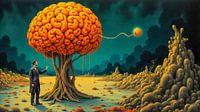 In dit fascinerende werk verrijst een monumentale boom waarvan de kruin de vorm heeft van een reusachtig brein. Het brein lijkt te leven, alsof het pulseert, terwijl oranjekleurige druppels uit zijn takken stromen en langzaam op de grond druppelen. De boom is diep geworteld in een mystiek landschap omringd door zachte, gele en…