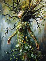 Haar lichaam rijst op uit een zee van kleurrijke tulpen, terwijl haar elegante jurk bestaat uit grote, levendige bladeren. De mouwen van haar gewaad vloeien sierlijk over in ranke takken en kleine blaadjes, alsof ze zich verenigt met het landschap zelf. Gouden accenten vangen het licht en geven het werk een bijna goddelijke uitstraling.