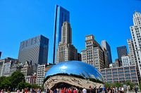 Deze boon (The Bean; Cloud Gate; spiegelbol) is een kunstwerk van de Britse kunstenaar Anish Kapoor. Het is dé blikvanger op het AT&T-plein in het Millennium Park in Chicago. De foto is op 7 augustus 2019 gemaakt.