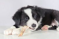 Het hondenras de border collie is een ras wat gebruikt wordt voor het drijven van de schapen. Deze border collie pup geniet van zijn gedroogde vlees waar hij graag op kauwt.