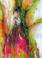 Een ecoline en zwarte inkt tekening van een bosnimf. Zij is een mythisch wezen en kijkt een beetje bedeesd en nieuwsgierig naar de wereld buiten het bos, wat staat haar daar te wachten?