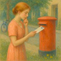 Een vrouw staat stil bij een felrode brievenbus. In haar hand houdt ze een brief, haar gezicht naar beneden gericht in diepe overpeinzing. Haar andere hand raakt haar kin aan, alsof ze zich nog één keer afvraagt of ze de brief echt wil versturen. De achtergrond is rustig en zacht, een verlaten straat met schaduw van bomen en een fiets op afstand.