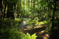 Oude rotte houten brug over een kleine beek in het hout in Spessart in Beieren, Duitsland