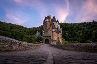 Een foto van de brug naar Burg Eltz net na zonsondergang. Dit kasteel is alsof het rechtstreeks uit een sprookje komt. Het is gebouwd in de 12e eeuw en sindsdien van generatie op generatie doorgegeven binnen dezelfde familie, die er nu nog steeds in wonen!