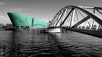 Het Nemo museum in Amsterdam kent een typische archictuur die hier met selectief kleurgebruik en zwart wit goed naar voren komt. Via de brug over het Amsterdamse Oosterdok is Nemo bereikbaar.