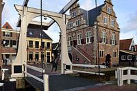 Over de brug (Dambrug) in het centrum van de oude stad De Rijp in Nederland. Achter de brug staat het historische stadhuis en andere eeuwenoude gebouwen.