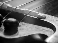 Close up van de brug van een akoestische gitaar in zwart wit