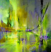 Goudkleurig licht met een glinstering van groen en violet: een abstract geschilderde brug overspant een met licht gevulde vlakte, een silhouet van huizen en een vage skyline.