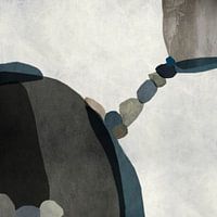 Minimale abstracte compositie met neutrale tinten. Kleine afgeronde stenen ondersteunen elkaar en vormen een brug.