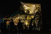 Enkele mensen buiten de bouwtent van een corsowagen bekijken het resultaat van de corsowagen die nog in de bouwtent staat.