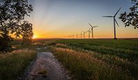 Zonsopgang, Mariadijk, Ooltgensplaat. Landschap waarin de zon opkomt over een landschap met weiland, windmolens en een vervallen weg.