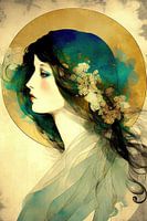 Een vrouw lost zich op in een moment van diepe overpeinzing in dit werk, waarbij zachte kleuren en vloeiende lijnen haar rustige gemoedstoestand onderstrepen. De dromerige sfeer is voelbaar door de harmonie van warme tinten en subtiele lichtaccenten, die een serene ambiance creëren. De fijnzinnige details in haar gezicht en houding nodigen de toeschouwer uit om mee te verdwalen in gedachten, terwijl de abstracte vormen en schaduwen de complexiteit van het innerlijke landschap benadrukken. Een boeiende combinatie van rust en mysterie, perfect voor een interieur dat vraagt om ingetogen elegantie.