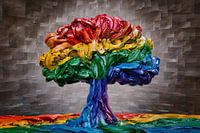 Dit levendige kunstwerk vangt de essentie van vitaliteit en passie met zijn explosie van kleuren. De abstracte interpretatie van een boom vertegenwoordigt groei en leven, een symbool van hoe diversiteit samenkomt om een harmonieus geheel te vormen. De dikke, bijna tastbare penseelstreken voegen een dynamische textuur toe die de zintuigen prikkelt. Het is een stuk dat zowel kracht als vreugde in elke ruimte zal brengen, perfect om een statement mee te maken in een moderne woonkamer of een creatief kantoor. Elke blik op dit schilderij biedt een nieuw perspectief, een nieuw detail om te ontdekken, en het houdt nooit op met inspireren.