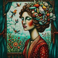 De kamer is gevuld met natuur, met bloemen die bloeien alsof ze ongevraagd maar toch welkom zijn, hun kleuren ademen leven in de ruimte. Twee vogels zitten boven haar hoofd, hun aanwezigheid is zowel ongewoon als rustgevend. Ze symboliseren vrijheid en evenwicht. Ze lijken zich helemaal thuis te voelen op deze surrealistische kroon, alsof ze symbool staan voor haar verbondenheid met de wilde, onuitgesproken ritmes van de natuur.