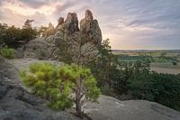 Een kleine dennenboom voor het wapen van Hamburg kort voor zonsondergang. Foto genomen tijdens een wandeling over de Teufelsmauer in het Harz gebergte.