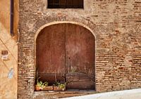 Een steil aflopende straat passeert een rustieke rode deur badend in indirect zonlicht met een paar decoratieve planten die op de trede groeien.