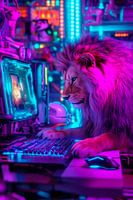 In een futuristische digitale jungle zit een majestueuze leeuw voor een fel verlicht scherm. De neonkleurige lichten weerkaatsen zijn majestueuze manen en creëren een surrealistische sfeer. Gefascineerd tikt hij op het toetsenbord alsof hij de geheimen van een virtuele wereld probeert te ontcijferen, terwijl de technologie om hem heen…