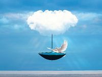 Surrealistische creatie geïnspireerd op de werken van R. Magritte. Een duif die graag verkoeling zoekt in een paraplu gevuld met regenwater