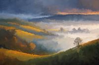 Glooiende heuvels badend in gouden zonlicht vullen het onderste deel van de scène, met een eenzame boom rechts in het midden. In het midden van de achtergrond hangt zware mist die naadloos overgaat in een dramatische, bewolkte lucht met oranje tinten van dageraad of schemering.