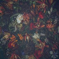 Een lay flat botanische collectie van verschillende, Camellia, Rata, Hibiscus, inheemse Australische en andere bloemen en botanische elementen op een donkere getextureerde achtergrond