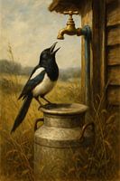 Een schilderij met een landelijke sfeer, waarop een ekster op een oude metalen melkbus staat. De vogel kijkt met open snavel omhoog naar een koperen kraan, alsof hij wacht op een druppel water. De achtergrond toont een zacht, bewolkt landschap met lange grassprieten op de voorgrond, wat een gevoel van rust en verlangen creëert.