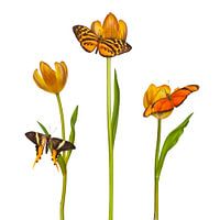 retro beeld van drie oranje vlinders op oranje tulpen tegen een witte achtergrond