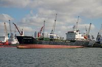 De tanker voor anker in de Waalhaven Rotterdam. De trossen vanaf het achterschip naar de meerpaal. Op de achtergrond de massa hijskranen op de kade van de haven e aan dek van schepen. Dat is wel de horizon van de Waalhaven. De lichte wolken langs de blauwe lucht de zon zet de haven in een…