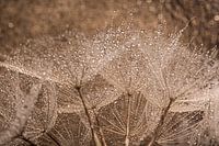 "De druppels schitteren tussen de beige, goud en bruintinten" is een macrofoto van waterdruppels op zaadpluisjes van schuin onderaf gefotografeerd. Deze bewerkte foto heeft bruin, beige en  goudkleurige tinten en een achtergrond met druppels.
