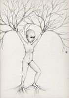 Een tekening in grijspotlood van een vrouw die verweven is met een boom; een dryade. Dryaden zijn in de Griekse mythologie boomnimfen. Als een sterfelijke een boom beschadigde, dan werd deze door de dryaden gestraft.