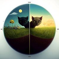 "The Duality of the Guardians" is een betoverende reflectie op tijd, natuur en perceptie. Dit kunstwerk met een gespleten bol toont twee mystieke katten - beschermers van dag en nacht - in een surrealistische sfeer die schemering en dageraad, maan en zon, schaduw en bloesem verenigt.
