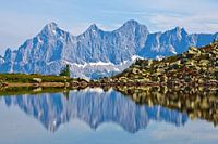 De hoge Dachstein wordt weerspiegeld in het kristalheldere spiegelmeer op de Reiteralm, omringd door een paar berggeiten