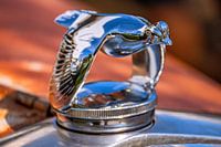 Deze macrofoto toont een glanzend, verchroomd radiatorrooster in de vorm van een vogel. Het staat in scherp contrast met de verweerde, roestige motorkap waarop het is gemonteerd. Gefotografeerd door Photoart-Naegele 2025