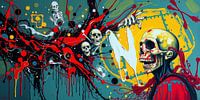 De afbeelding toont een dramatisch, donker scenario met een skelet dat uitsteekt uit een abstracte achtergrond van donkere en felle kleuren. Spatten rode en zwarte verf doen denken aan bloeddruppels en symboliseren de constante cyclus van leven en dood. Op de achtergrond zijn andere skeletten en schedels te zien, die uit de duisternis lijken te turen alsof ze verstrikt zijn in een web van het lot. In het midden van de afbeelding gloeit een gele ring, bijna als een zon of een portaal, die de afbeelding een spookachtige helderheid geeft. Het motief is diep abstract en surrealistisch, en laat ruimte voor de eigen interpretatie van de kijker.