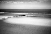 Zwart wit beeld van de Zeeuwse kust. De contrasten laten de paaltjes een hoofdrol spelen in het beeld. Het strand is leeg wat het beeld rust en eenvoud geeft. Een mooi beeld om bij weg te dromen.