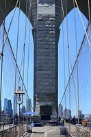 We passeren de eerste pilaar van de Brooklyn Bridge in New York, VS. Eindelijk wat schaduw, want de hitte werd ondraaglijk. Ook tijd om de verbazingwekkende bouwwerken te bewonderen.