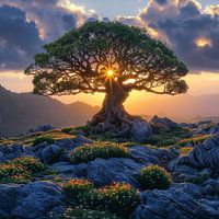 Het water weerspiegelt de hemel, een kalme spiegel waarin de boom zijn eigen ziel ontmoet. De lucht is doordrongen van een gouden gloed, een laatste omhelzing voordat de nacht valt. Een eenzame steen rust aan de waterkant, een stille getuige van de seizoenen die komen en gaan.