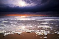 Door de wind opgejaagd schuim spoelt aan op het Noordzeestrand van Noord-Holland. Het blijft liggen en af en toe haalt het water het schuim terug de zee in om het opnieuw op het strand te werpen.