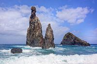 Ribeira da Janela is een gemeente aan de noordkust van Madeira, op slechts 2 km van Porto Moniz. Drie rotsachtige eilandjes, de Ilheus da Ribeira da Janela, liggen schilderachtig vlak voor het strand. Genomen in het voorjaar van 2023. Portugal, Madeira.