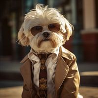 Een schattige witte Shih Tzu hond, Columbo stijl, draagt een ronde zonnebril en een elegante beige blazer met een gestreept shirt eronder, zit op een straathoek tijdens het gouden uur. Dit fotorealistische portret is gemaakt met een kleine scherptediepte en een zachte achtergrond. De gedetailleerde bontstructuur en het zachte zonlicht dat zachte schaduwen werpt, zijn ook gemodelleerd in de stijl van fotorealistische portretfotografie.