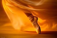 Een vleugje gratie in warme gouden tinten, met een focus op de elegante voet in een spitzenschoen die het gevoel van lichtheid en beweging belichaamt. Deze kunstzinnige voorstelling brengt een levendige dynamiek in elke kamer en is bijzonder geschikt voor de woonkamer of dansruimte om creatieve inspiratie op te doen.