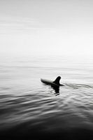 Een majestueuze schaduw snijdt door de zachte golven, terwijl het licht van de horizon weinig meer dan een zachte gloed achterlaat. Het kalme oppervlak weerspiegelt de stilte van het moment en laat ruimte voor de verbeelding terwijl het silhouet sierlijk de oneindigheid in glijdt. Een stille getuige van de mysterieuze diepten van de zee.
