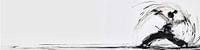 Deze dynamisch geabstraheerde, monochrome afbeelding in lang formaat toont een kung fu-vechter met wijd gespreide benen tijdens de training. De abstracte vormen en lijnen geven de energie en intensiteit van kungfu-training weer. De vechter straalt kracht en concentratie uit terwijl hij in een karakteristieke houding staat. Het…