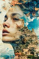 Het gezicht van een vrouw, waarin oude ruïnes en moderne gebouwen zijn geïntegreerd, vormt het middelpunt van dit kunstwerk. De details van de architectuur versmelten harmonieus met de delicate gelaatstrekken en slaan een brug tussen de mens en de geschiedenis. De ruïnes verwijzen naar voorbije tijdperken, terwijl het heldere blauw van de lucht naar de toekomst kijkt.