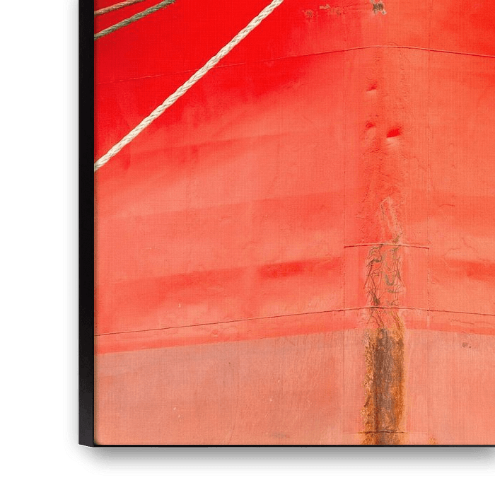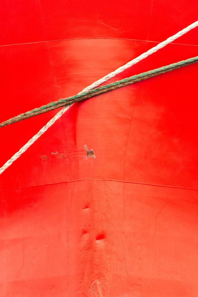 De feloranje boeg, met de trossen die er strak voorlangs lopen, toont kleine deukjes en roestsporen die een prachtig contrast vormen in het heldere oppervlak. Afgemeerd in de haven, net klaar met laden of lossen, ligt de boeg er stil en sereen bij — een moment van rust voor het reusachtige schip.