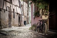 Verstild straatbeeld met een geparkeerde fiets, vakwerkhuizen, wijnranken en kinderkopjes in het middeleeuwse wijndorp Eguisheim. Reisfotografie, regio Elzas, Frankrijk
