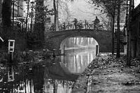 De fietsers op de Magdalenabrug over de Nieuwegracht in Utrecht (zwartwit). Deze foto werd op 7 november 2025 gemaakt door de Utrechtse fotograaf André Blom in het kader van zijn al meer dan tien jaar lopende foto project 'De Utrechtse Grachten'.
