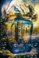 De fles zegt drink mij, is alsof de fles zelf praat, wat natuurlijk niet het geval is. Bovendien het drinken van deze inhoud is wellicht wat moeilijk, aangezien er een torengebouw in zit. Deze mooie blauwe fles heeft een ouderwetse kurk als dop, net zo ouderwets is het touw dat om de hals van de fles zit. De fles staat in een landschap, een wei met wilde bloemen en is gevuld met een torengebouw, iets wat je dus echt niet drinkt. De hand erboven staat op het punt de fles mee te grissen. Hierbij lijkt het alsof die hand twee vogels weg probeert te jagen, wat niet echt heel goed lukt zo te zien. Een surrealistisch werk, maar toch in een retro stijl. De kleuren zijn diverse kleuren blauw en oranje, taupe, beige, geel en roze. Een surrealistisch retro werk, wat het op vele plaatsen in huis goed zal doen, in de kamer maar natuurlijk ook in de keuken.