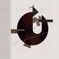 Abstract minimalistisch kunstwerk van Roberto Moro. Geometrische vormen, fijne zwarte en witte lijnen en warme bruine tinten kenmerken de compositie op canvas textuur.