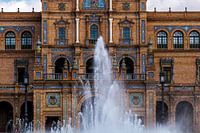 Een close-up van het plein van de Plaza de España met op de voorgrond een fontein.